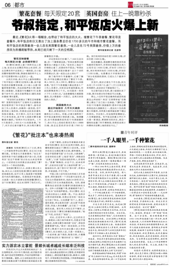 最近,《繁花》火得一塌糊涂,也带动了和平饭店的大火。继繁花下午茶套餐、繁花导览套餐外,和平饭店昨日又推出了加上服务费总价在1700多元的午市和晚市繁花套餐。而和平饭店的英国套房一会儿改名英国繁花套房,一会儿改名72号英国套房,价值上万的套房因为热播剧被带热,本周已经只剩下一天的空档期。 青年报首席记者 范彦萍 繁花定制套餐 每天限定20套 必须提早预订 在《繁花》剧里上演了各种舌尖上的上海,宝总出去应酬后再怎么吃龙虾,回去总要在玲子这里吃上一碗泡饭,汪小姐则最钟情排骨年糕,馋涎欲滴的样子让人忍不住想要冲到小店里买上一盒。 从昨天开始,各大平台上就争相晒出了和平饭店×《繁花》定制双人餐,其中就包括凤求凰繁花味碟、汪小姐心头爱(甜酱排骨脆年糕)、范总的焖声发大菜(清炒菜心焖香菇)、至真园今冬爆款牛河(韭黄香干炒牛河)、夜东京新晋甜点(腐乳泡饭冰激凌)等8道菜。 “听说你们这里推出了繁花定制套餐啊?里面有泡饭吗?”记者昨天以顾客的身份联系到了和平饭店中餐厅,接电话的工作人员表示,的确有一款泡饭,但不是传统上海泡饭,而是经过改良的腐乳泡饭冰激凌。对方表示,当天自己接到不少来电咨询,其中有七成是对繁花套餐感兴趣的。“你明天可以现场买。1月4日是原价,1460元+16.6%服务费。”末了,对方劝记者尽量早点,因为每天繁花套餐限定20套。 评论里网友们吵翻了,“1460元没问题,但一个硬菜都没卖。”有网友推荐在套餐里加入椒盐大王蛇。“现在在上海这个价格很公道了,还是在和平饭店。”有网友调侃说,“腐乳泡饭冰激凌?这三个词拆开我都认识,放一起怎么这么陌生?” 除了晚市和午市套餐外,记者了解到,和平饭店最近还推出了繁花下午茶,单人599元、双人999元,需要加16.6%服务费。“你们下午茶套餐大概会卖多久?”工作人员表示,目前还没有接到通知,但起码要售卖两三个月。时间是周一到周六下午2点到5点。“这些套餐每天都是限量的,至少要提前一天预订。这两天来咨询的人很多。” 英国套房大火 最近开始涨价 几乎天天满房 最近,剧里提到的178平方米的英国套房也大火特火。昨晚,记者又联系到了和平饭店套房预订部的龚小姐。她透露说,如今英国套房改名成72号英国套房了,各大平台上的标价是周五周六18888元/晚,饭店这里的折扣价是17000元/晚。周日到周四的标价是16888元/晚,折扣价是15000元/晚。 她还透露说,英国繁花套房原来和其他套房价格持平,往常的价格是周五周六比标价近14000元/晚,折扣价12000元/晚,周日到周四标价13000元/晚,折扣价11000元/晚。也是最近才开始涨价的。“因为电视剧的原因,它成为几个套房中最贵的。” 交流中,她劝记者先下手为强,因为本周1月4日到7日,除了1月5日周五还有档期外,其余的日子都被预订了。 当记者问起长包房,龚小姐顿时来了兴致,表示如果长包价格还可以优惠。 那么,入住和平饭店套房的感觉到底是怎么样的呢?网友“吉弗蒂学姐”在微博上晒出了自己的入住体验,“《繁花》剧中的72号套房(英国套房)是和平饭店最具特色的九国套房之一,我这次入住的是意大利套房,同样是无数明星政要下榻过的房间。历史悠久,但设施明显翻新过,入住便捷舒适。和平饭店的意义早已不只是一家酒店,更是鲜活的历史,酒店一楼特别设置了和平博物馆,珍贵的老照片和器皿诉说着上海的前世今生。”