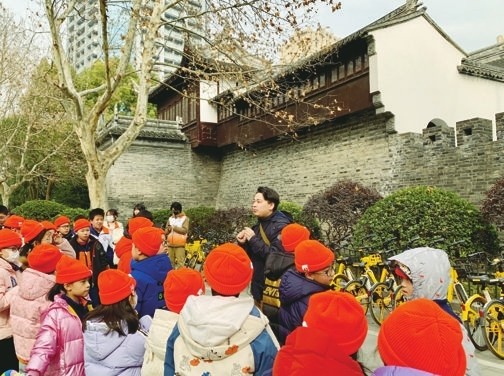 在来到小北门站时,孩子们还在老师和志愿者的带领下,下车零距离观赏了大镜阁的古城墙。“明嘉靖时期,倭寇连续五次从海上入侵上海,烧杀掠抢。这一年,为抵御倭寇入侵,上海就在黄浦江边筑起了城墙……”五年级学生沈栩禛曾在2023年5月,参加过由街道组织的“环城寻门记”,现在仍记忆犹新,因此他自告奋勇地为同学们做了一段讲解,他说自己非常喜欢参加类似的体验活动,让自己有机会了解“藏”在身边的历史和文化。