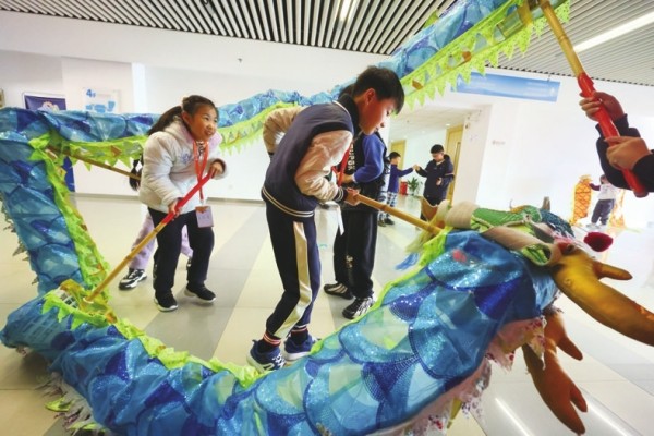 在三林镇的爱心寒托班孩子们体验到独具特色的传统民俗文化——三林舞龙。