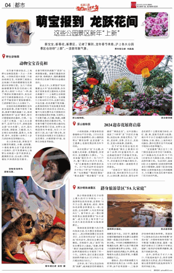 新宝宝,新春花,新景区。记者了解到,龙年春节来临,沪上各大公园景区也纷纷“上新”,一派新年新气象。 青年报记者 刘晶晶 野生动物园 动物宝宝首亮相 农历春节脚步临近,上海野生动物园里是一天比一天热闹。小动物乐园内快满1月龄的棕熊宝宝、非洲狮三胞胎以及快满3月龄的黑猩猩宝宝是首次和游客见面。这几个奶娃娃都需要保育员们的细心照顾,和人类的“小毛头”一样,除了喝奶时闹腾活跃外,其他时间它们都是酣睡状态,不过这奶乎乎睡觉的可爱软萌模样,已把游客们的心儿也萌化了。 活泼好动的黑猩猩红豆和皮皮姐弟俩,在春节前有了新居,新家布置的童趣十足,新添置的栖架和“运动”器材,特别讨猩猩姐弟的喜欢,它俩,一会儿盘个大转盘、一会儿又去荡秋千,玩得不亦乐乎,游客戏称这是“功夫名猩”。此外,园内羊驼苑、袋鼠坡、天鹅湖、车入区等已迎来袋鼠、蓝角马、长角羚、羚牛、羊驼等十余种三十多只的动物宝宝相继出生。 在小动物乐园,游客还可以看到耳廓狐、水獭、细尾獴、小食蚁兽等众多可爱呆萌的小动物外,还可免费参与上海野生动物园×我不是胖虎主题展陈活动,这也是上野和潮玩IP胖虎的首次联名,在春节期间胖虎旗下“肥龙”也将倾情加盟。游客们喜爱的老虎扑食、棕熊跳水、猎豹赛跑等科普项目在春节期间也会增加场次。 除此之外,为营造好“欢欢喜喜过大年”的良好氛围,华东地区首家老虎主题特色大型综合类餐厅——上海野生动物园老虎餐厅已正式营业。老虎餐厅占地4600平方米,坐落于园区中央位置,在老虎餐厅里用餐,品美食的同时可近距离多角度看看老虎们的自然生活状态。餐厅与居住着百余只狐猴的沉浸式狐猴岛展区相望,与拥有上千羽黑天鹅、白天鹅、鹈鹕、鸿雁等珍稀鸟类的天鹅湖比邻。今年春节餐厅还特别推出晚间包房私房菜预订活动,在野生动物园里吃年夜饭,当日14:30就可入园,且入园门票全免,还可享受园内电瓶车专车服务以及投喂车、水域探秘VIP船、动物互动等多项体验。 辰山植物园 2024迎春花展将启幕 小动物迎新,丰富多彩的迎春植物也不甘示弱。2月8日至2月26日新春期间,辰山植物园将以“繁花似锦 金龙迎春”为主题奉上迎春花展及系列年节活动。 本次花展以“龙”为主题,共设置九龙闹春、龙潭春晓、龙游四方、龙迎富贵4大展区。 “九龙闹春”展区位于一号门大厅内,整个展区以牡丹为主体,“龙”元素植物为辅穿插在其中。35个牡丹品种80余盆牡丹中有6个带“龙”字的牡丹品种:“乌龙捧盛”“青龙卧墨池”“青龙盘翠”“青龙镇宝”“赤龙焕彩”“黑海金龙”。此外还精心挑选了9种带“龙”字的花卉植物,如龙吐珠、芳香龙面花、“龙”柏、龙血树、龙骨、龙舌兰、龙船花、龙虎山秋海棠、龙眼等。 位于矿坑花园台地区的“龙潭春晓”展区主要展示50余个品种220盆催花牡丹,通过高超的园艺手段催花而放。牡丹以自然式手法丛植于台地中,并在望花区种植点缀牡丹,为冬日矿坑增添一抹提前而至的春色。 “龙游四方”展区位于展览温室A馆,将杜鹃花作为主打花卉,以游花景、染花妆、登花台和品花韵四个主题花境为特色,以红、橙、黄、蓝紫四色系为线索,将分布于长江流域的杜鹃分别与青海、云南、湖北、上海四地文化融合,展示杜鹃花在不同地域中绽放出的多面魅力。 “龙迎富贵”展区位于二号门展览温室共享空间个体展馆,以个体精品牡丹品种74个约150盆牡丹为展陈主体,并配以品种科普介绍。与此同时,温室B馆(沙生植物馆)还将同期布展龙舌兰等植物,温室C馆(珍奇植物馆)也将种植各色兰科的蝴蝶兰、大花蕙兰和朱顶红等年宵热门花卉烘托气氛。 西沙明珠湖景区 跻身旅游景区“5A大家庭” 西沙明珠湖景区位于世界上最大的河口冲积岛——上海崇明岛的西南端,总面积7.8平方公里,集湿地、湖泊、森林和沼泽等多种景观为一体,在这里,生动诠释“人与自然和谐共生”。春节前夕,这一景区顺利跻身全国旅游景区“5A大家庭”,成为目前上海市首个以生态为底色的国家5A级旅游景区。 明珠湖是崇明最大的天然内陆淡水湖,作为景区发展亲历者之一,西沙明珠湖景区党支部书记、主任徐忠和这块“生态宝地”相伴多年,密切关注着它的蝶变。在他眼中,湖上“居民”的变化着实令人振奋。“你看,穿着‘黑衣’的就是野鸬鹚,2023年首批野鸬鹚相较去年提前了约一个月。近两年,我们在景区观测到的野鸬鹚也从2010年的十几只增加到近500只。” 近年来,有了好生态这张响亮“招牌”,越来越多的珍稀候鸟频繁现身于此。2022年,摄影爱好者郑耀虎就有幸在景区拍摄到国家一级重点保护动物——中华秋沙鸭。中华秋沙鸭属鸭科秋沙鸭属的鸟类,属于比扬子鳄还稀少的国际濒危野生动物。目前,除每年报到的鸬鹚之外,野鸭、鹬等候鸟也是这里的常客,白鹭更是随处可见。 据统计,西沙明珠湖景区内观测到的鸟类已达149种、鱼类67种,其中还有国家一、二级保护动物和濒危物种等。我国首个以湿地命名的生物学新属“崇西水虱”、中国特有物种号称“鸟中熊猫”的震旦鸦雀、国家一级保护动物长江江豚和中华鲟及国家二级保护动物野鸬鹚等,是其中的典型代表。 此外,崇明处于长江入海口、中国海岸线中点,具有深厚的航海文化积淀,西沙明珠湖区域也是我国明代航海家郑