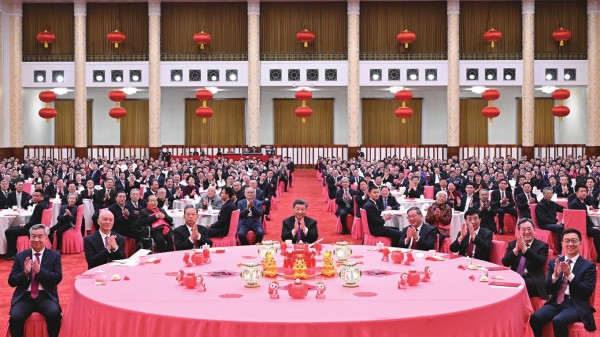 中共中央、国务院8日上午在人民大会堂举行2024年春节团拜会。中共中央总书记、国家主席、中央军委主席习近平发表讲话,代表党中央和国务院,向全国各族人民,向香港特别行政区同胞、澳门特别行政区同胞、台湾同胞和海外侨胞拜年。 习近平强调,即将过去的癸卯兔年,是全面贯彻党的二十大精神的开局之年。面对异常复杂的国际环境和艰巨繁重的改革发展稳定任务,我们以中国式现代化凝心聚力,统筹国内国际两个大局,顽强拼搏、勇毅前行,战胜多重困难挑战,在全面建设社会主义现代化国家新征程上迈出坚实步伐。 李强主持团拜会,赵乐际、王沪宁、蔡奇、丁薛祥、李希、韩正等出席。 人民大会堂宴会厅灯光璀璨、喜气洋洋,各界人士齐聚一堂、共迎新春,现场洋溢着欢乐祥和的节日气氛。 上午10时许,在欢快的乐曲声中,习近平等党和国家领导人步入大厅,向大家挥手致意,同大家互致问候、祝福新春,全场响起热烈掌声。 习近平在讲话中指出,一年来,我们全面贯彻新发展理念,坚持稳中求进工作总基调,果断实行新冠疫情防控转段,推动经济恢复发展,经济总量超过126万亿元,粮食总产再创新高,就业、物价总体平稳,放眼全球仍然是“风景这边独好”。科技创新实现新突破,新质生产力加快形成。改革开放不断深化,新一轮党和国家机构改革基本完成。生态环境持续改善。国防和军队现代化迈出新的步伐。成功举办成都大运会、杭州亚运会,我国体育健儿创造良好成绩。纵深推进全面从严治党和反腐败斗争,不断巩固良好政治生态。我们坚持人民至上,着力保障和改善民生,持续巩固拓展脱贫攻坚成果,用心用情解决人民群众急难愁盼问题,全力以赴应对自然灾害和推动灾后恢复建设,社会大局保持稳定。我们积极支持香港、澳门更好融入国家发展大局,坚决反对“台独”分裂行径和外部势力干涉,有力捍卫国家主权、安全、发展利益。扎实推进中国特色大国外交,为变乱交织的世界增添确定性和正能量,展现了推动构建人类命运共同体的责任担当。 习近平强调,回顾一年来的拼搏奋斗,我们更加深切地体会到,以中国式现代化全面推进强国建设、民族复兴伟业,既是中国人民追求美好幸福生活的光明之路,也是促进世界和平和发展的正义之路。只要我们坚持道不变、志不改,一以贯之、勠力同心,就一定能够战胜前进中的各种艰难险阻,不断迈向成功的彼岸。 习近平指出,2024年是新中国成立75周年,是实现“十四五”规划目标任务的关键一年。我们要坚持稳中求进工作总基调,贯彻稳中求进、以进促稳、先立后破的要求,完整、准确、全面贯彻新发展理念,统筹高质量发展和高水平安全,突出重点、把握关键,锐意进取、真抓实干,切实增强经济活力、防范化解风险、改善社会预期,巩固和增强经济回升向好态势,持续增进民生福祉,保持社会大局和谐稳定。 习近平强调,要进一步全面深化改革,着力破解深层次体制机制障碍和结构性矛盾,充分激发全社会创业创新创造活力,为推进中国式现代化注入强大动力,使中国式现代化建设披荆斩棘、一往无前。 习近平指出,龙是中华民族的图腾,具有刚健威武的雄姿、勇猛无畏的气概、福泽四海的情怀、强大无比的力量,既象征着五千年来中华民族自强不息、奋斗进取的精神血脉,更承载着新时代新征程亿万中华儿女推进强国建设、民族复兴伟业的坚定意志和美好愿望。甲辰龙年,希望全国人民振奋龙马精神,以龙腾虎跃、鱼跃龙门的干劲闯劲,开拓创新、拼搏奉献,共同书写中国式现代化建设新篇章。 团拜会上,文艺工作者表演了精彩的节目。 中共中央、全国人大常委会、国务院、最高人民法院、最高人民检察院、全国政协、中央军委领导同志和老同志出席团拜会。 参加团拜会的还有中央党政军群各部门及北京市负责同志,各民主党派中央、全国工商联负责人和无党派人士代表,离退休老同志代表,著名专家学者及首都各界人士代表。 据新华社电 ■02