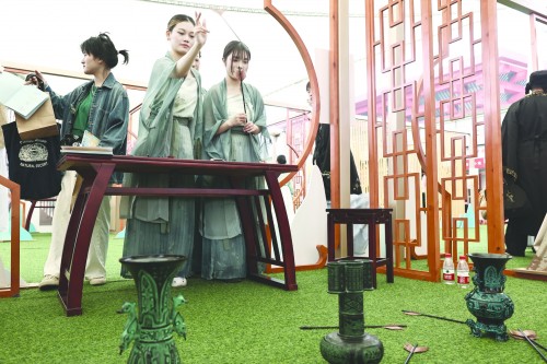 展位上的文创也充满吸引力。帆布包上的图案灵感来源于“山海经”的瑞兽,“宋韵鸣香”系列文件夹则以宋徽宗的花鸟小品为灵感,将宋代文化的韵味融入产品中。蔡钰茹表示,这些充满中国传统文化元素的文创来源于去年举办的首届中国高校原创时尚汉服设计群英会,由创意稿件转化为文创产品,在国风市集与华服爱好者见面,也让传统文化在日常生活中焕发出新的光彩。