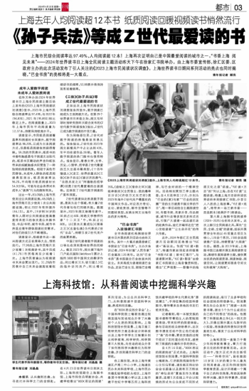 上海市民综合阅读率达97.49%,人均阅读超12本!上海再次证明自己是中国最爱阅读的城市之一。“书香上海 阅见未来”——2024年世界读书日上海全民阅读主题活动昨天下午在徐家汇书院举办。由上海市委宣传部,徐汇区委、区政府主办的此次活动发布了引人关注的《2023上海市民阅读状况调查》。上海世界读书日期间系列活动的亮点也同时揭晓,“巴金书房”的亮相将是一大看点。 青年报记者 郦亮 成年人爱数字阅读未成年人爱纸质阅读 在昨天举办的2024年世界读书日上海全民阅读主题活动上发布的《2023上海市民阅读状况调查》显示,2023年上海市民综合阅读率达97.49%,与2022年(96.83%)、2021年(95.85%)相比稳定上升。在阅读数量上,2023年上海市民年平均阅读量为12.37本,持续保持较高水平。 调查显示,市民纸质阅读覆盖率和阅读时长双提升,数字阅读率达98.20%,已成为主流阅读方式,但是纸质阅读依然获得青睐。59.2%的市民表示,纸质书的书香和触感是电子阅读无法取代的,纸质书页翻动的声音和纸张带来的细腻触感共同营造了一种独特的阅读氛围。相较于其他市民群体,未成年人群体的纸质阅读表现突出,纸质阅读率达96.2%,平均每日纸质阅读时长54.9分钟。可能与社会各界对未成年人“读屏”行为的限制有关。 过去一年,83.0%的上海市民使用过公共阅读设施,48.0%的上海市民每月至少使用1次公共阅读设施,相比2022年有所提升(46.1%)。其中,19岁到34岁的青年人群对公共阅读设施满意度排名前三的依次是公共图书馆、书店/书吧、城市书房,城市书房适应青年群体阅读社交需求,对他们的吸引力不断增强。 调查显示,视频读书这一新兴阅读方式正在席卷大众、悄然流行。77.9%的上海市民每月至少观看1次视频讲书,其中四成(41.7%)市民每周至少观看1次。上海市民普遍认为视频读书未来会更加流行。31.2%的市民表示自己未来会提高观看视频讲书的频率,52.8%表示将保持现有观看频率。 《三体》《孙子兵法》等成Z世代最爱读的书 正如这次上海市民阅读状况调查报告所显示,数字阅读已经成为主流阅读方式。在第29个世界读书日来临之际,阅文与环球时报研究院昨天联合发布的《Z世代数字阅读报告》指出,Z世代已成为数字阅读的中坚力量。 作为网络原住民,Z世代对数字阅读的热情是显而易见的。报告指出,Z世代在2023年阅文新增用户中占比达到43%,年平均在读作品28部。青年人数字阅读的热门图书也很有特点。报告显示,青春文学、文学、历史、心理学、哲学是Z世代最爱的五大出版书籍类型,《十四年猎诡人》《龙王:世界的重启》《三体》《孙子兵法》《被讨厌的勇气:“自我启发之父”阿德勒的哲学课》则是Z世代最爱看的出版读物。这体现了Z世代数字阅读的广度和深度。 Z世代读者如此热衷数字阅读,是因为这个领域,有大量Z世代作者与他们同频共振。数据显示,2023年阅文新增作家中,00后占比60%;网络文学榜样作家“十二天王”中,95后占比80%。以《我本无意成仙》《御兽之王》《玄鉴仙族》为代表的Z世代“出品”,持续引发Z世代用户的追更热潮。 中国Z世代读者数字阅读的口味也在深刻影响世界的同龄人。截至2023年,阅文旗下海外门户起点国际(WebNovel)累计上线约3800部中国网文的翻译作品,同比增长31%;吸引超2.3亿的海外访问用户,同比增长35%。《诡秘之主》《宿命之环》《超级神基因》《全民领主:我的爆率百分百》《许你万丈光芒好》是2023年海外Z世代用户最喜欢的中国网文作品,对应西方奇幻、玄幻、游戏竞技、都市言情等不同题材类型,反映出网文出海作品的多元格局。 “巴金书房”入驻徐家汇书院 全市各阅读机构围绕世界读书日开展的系列活动也在昨天发布。其中一大看点就是徐家汇书院设立“巴金书房”。主办方告诉记者,2024年时值“人民作家”巴金诞辰120周年。这间“巴金书房”是书院联合巴金故居共同设立。未来将成为读者阅读巴金作品、走进巴金生活、领悟巴金精神、与巴金对话的一个精神空间。活动特别策划三季主题内容,自4月延伸至12月,分别为“巴金的《家》与家”“巴金的朋友圈”“您的生日就是中国文学的节日”,每一季活动结合主题阅读空间、专题书架、名家分享、作品朗读、城市行走等多层次多形式活动,引领广大读者一起品读巴老的经典作品,追忆并缅怀这位“把心交给读者”“让生命开花”的伟大作家。 此外,2024年徐汇区全民阅读月 活动期间还将推出“YUE读+”新玩法。包括“YUE读+散文”,特邀作家赵丽宏老师做客“书院YUE读 | 新书汇客厅”,与读者面对面。“YUE读+影音”由徐家汇书院联合上海音像资料馆,推出“汇声绘影——影像中的海派文化之源”讲座。“YUE读+方志”的“何以上海,志在YUE读”主题讲座,特邀上海方志讲师团优秀讲师来到徐家汇书院,分享引人入胜的上海故事。“YUE读+戏曲”,将带来一场兰韵书香——昆曲剧本(经典折子)朗读会。 第六届上海图书馆阅读季(2024-2025)也在昨天发布。此次上图引全民阅读之风,面向“全民、全龄、全域”的读者,组织开展贯穿全年的以45项重点项目为核心,120余个系列、1500余场阅读推广活动,持续营造“大阅读”生态。据悉,自2019年起,上海图书馆已连续开展五届阅读季活动,围绕年度阅读季主题,提供更加优质的阅读资源、阅读体验、阅读空间,让阅读更好服务守好