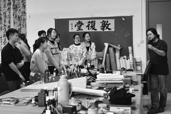 采访当日,正逢美术学院副教授王客的“书法篆刻创作”课,他正在对同学们进行行草大条幅的训练。王客把课堂时间分为两部分,大家将作业展示出来,被老师逐一点评后,进入下一阶段的教学和创作。