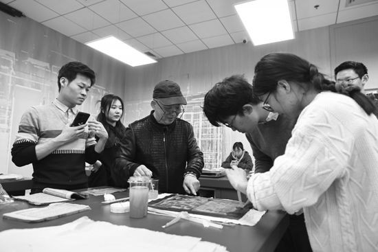 学生在老师的指导下修复古籍。