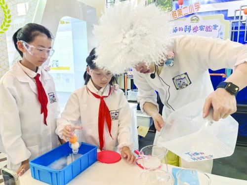 青年报记者 刘春霞 本报讯 用一根吸管蘸着肥皂水吹出一个泡泡,戴着手套用掌心去弹泡泡,泡泡不但没破还能一下下弹跳……昨天上午,2024第二十一届上海教育博览会在上海展览中心开幕,在黄浦区蓬莱路第二小学的展台,00后教师丁冯诚带领学生们做的各种有趣的实验吸引了很多目光。青年报记者现场采访发现,今年的教博会上,不少学校都拿出了在科学教育方面的亮点,全面展现上海在科学教育和科技创新人才培养方面具有示范性、引领性的体系设计、特色做法和重要成果。 各种有趣科学实验可互动体验 本届教博会上,黄浦区教育局的展厅分为三个板块和互动体验区,集中展示科学教育的前沿探索、创新英才的个性化培养。在互动展区,黄浦区蓬莱路第二小学的体验项目“丁老师的科学实验室”吸引了很多观众驻足体验。 取一个没有底的矿泉水瓶,倒置放入一颗乒乓球,然后往里注水,只见乒乓球始终在底部,没有上浮。这是为什么呢?丁冯诚老师给大家解释说,这是因为乒乓球把瓶口堵住了,水都跑到了乒乓球上面,这些水给下方的乒乓球很大压力,而且这个压力比浮力还大,所以乒乓球上浮不了。“想不想让它浮起来?”说着,丁冯诚老师用手掌堵住了下方的瓶口,乒乓球立即“嗖”地一下浮了上来。 此次教博会,丁冯诚一共准备了6个科学小实验,带着萌娃们在现场开展互动体验。毕业于上海师范大学物理系的丁冯诚在蓬二小学当自然学科老师已有两年,他的“丁老师的科学实验室”体验课已成为学校里最受欢迎的课程之一。 除了蓬二小学的体验项目,黄浦区的互动展区还有光明中学的“健康生活我主导”互动体验。而三天展览期间,黄浦教育展区共有11所学校带来12场科学体验项目。 以“水文化”为教育办学特色的闵行区华坪小学展台,也有不少亮眼的互动体验项目。记者了解到,在华坪小学,老师们创编了几十个适合孩子们体验的水实验,深受学生欢迎。 学生自己动手玩科创展现科学素养 除了各种互动体验项目,教博会上,各学校展示的学生们自己动手开展的科创项目也让人眼前一亮。 在上海市洋泾菊园实验学校的展台,一套阶梯状排列的实验装置非常吸引眼球,这是六年级学生江怡然、尤异利用学长留下来的一套装置改造而成的。 “这是一个基于智能控制的多米诺科普创新实验,它利用虹吸原理,将若干个化学实验连接在一起,只要控制第一个,它就可以继续下去,就像多米诺骨牌游戏一样。”江怡然介绍说,装置的第一个实验是碘酸钾与硫酸钠混合,生成碘单质;第二个实验是碘单质遇到淀粉颜色变蓝;第三个实验是碘单质遇到氢氧化钠后消失,颜色又变回无色;第四个实验是碱性的氢氧化钠遇到酚酞颜色变红;后面还有一个喷泉装置和废水回收装置。“这个实验装置将物理、化学、智能控制多个学科融合在一起,所以也是跨学科的多米诺智能控制。” 小学组的郭奕萱和两个小伙伴设计了一个智能收作业助手,只要扫一下作业上的二维码,电脑端就能立即显示谁交了作业,“谁没交也能一目了然。”郭奕萱说。 随着教博会开幕,上海教育影响力电子地图“科学育人版”也正式发布。该电子地图包括“上海市学生(青少年)科创教育基地地图”“上海科普教育体验基地站点地图”“全国中小学科学教育实验区、实验校(上海地区)地图”“上海市科技教育特色示范学校地图”“国家中小学人工智能教育基地(上海地区)地图”,方便市民查看本市校内外科学育人资源。