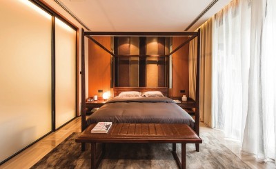 良好的光学性能之外,德国旭格门窗系统也拥有优越的隔音保暖功效,保证了卧室的安宁静谧。配合这种氛围,软装团队选取了云栖四柱床和港湾床头柜两款环抱式家具,营造出私密感和温馨感。