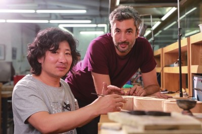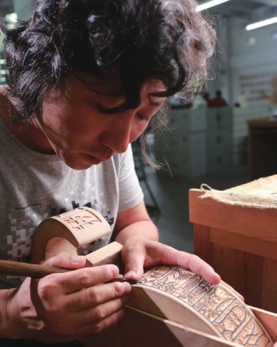 这次我们要讲述一块木头的故事,经过艺术家和匠人的牵手合作,这块普通的松木将成为一件艺术创意茶托。当饮茶者使用茶托时,会被深深感动,在一杯一饮中,会产生对大自然的关注和思考,如同清风拂面,内心安静澄澈。 2017年万物生长的五月天,上海公共艺术协同创新中心(PACC)迎来了20位来自全国各地身怀绝技的木雕匠人,进行非遗跨界创新创作,他们是文化部/教育部非物质文化遗产传承人群研修研习培训计划(木雕研修班)的学员们。其中有一位山东曲阜楷木雕刻匠人名叫褚涛,他淳厚质朴,笑容如五月温暖的阳光,擅长极为精细的透雕,他的镂空如意如同蕾丝般轻盈剔透,线条细腻流畅,造型端庄雅正。 与此同时,我们还迎来了阿根廷公共艺术家费德罗·贝克尔(Federico Bacher)的驻地创作,他修长英俊的脸庞如同莫迪里阿尼笔下的东方人物般充满南美神秘的气质,一旦笑起来,整张脸顿时如同绽开的花朵,充满热情和阳光。在2016年费德罗就作为PACC驻地艺术家创作了名为“竹绽放”的公共艺术装置,受到公众的喜爱和好评。 费德罗关注自然、热爱自然,在他的作品中时常能见到动物和树林等视觉元素。我特别喜欢他的一件公共艺术作品,是在阿根廷的一个地铁站里完成的,他将自己钟爱的白桦树林画满了整个地铁站的墙面,从通道、楼梯、站厅到站台,整个地下车站仿佛一片白桦林,仿佛能听到风声沙沙,树影摇曳,让行走匆匆的乘客从城市漫步到自然。 这一次,在非遗跨界创新设计课程中,两个笑容同样阳光灿烂的人相互吸引,牵手尝试从未有过的跨界创新。“阿根廷艺术家+中国匠人”能产生怎样的作品,给大家带来很多期待和想象。 费德罗和褚涛的合作就从一块松木开始,他们从茶文化出发开始构思。由于阿根廷人也有饮茶的习惯,而中国的茶文化博大深远,于是茶托成为一件创作的载体。费德罗对于动物的偏爱将中国蝾螈“娃娃鱼”这种濒临灭绝的动物形态置入创作中,并动手采用机械设备制作了茶托的整体外形,取名为“Salamander, Nature Care”,中文名为“萨拉曼达,自然关怀”。木雕匠人褚涛将自己的雕刻技术相当纯熟精炼地雕刻在茶托的侧立面,铭刻中国篆体书法字“善待自然,善待自我”,来表达“我是娃娃鱼,更是活化石,保护自然,我们也是自然的一部分”。 西方艺术思维与东方传统元素的结合,在这里得到充分展现。在人文关怀的理念下,作品既有实用性,又有艺术思考和自省的态度。费德罗和褚涛的合作不仅是跨专业的,也是跨国界和跨文化的,他们将艺术创作和匠人精神在这块木头上得到融合,身体力行,又一次刷新非遗跨界创新的可能性。 作者:章莉莉 上海大学美术学院 公共艺术博士、副教授 PACC上海公共艺术协同创新中心 运营总监 上海非物质文化遗产保护协会 常务理事 上海市包装技术协会设计委员会 副秘书长