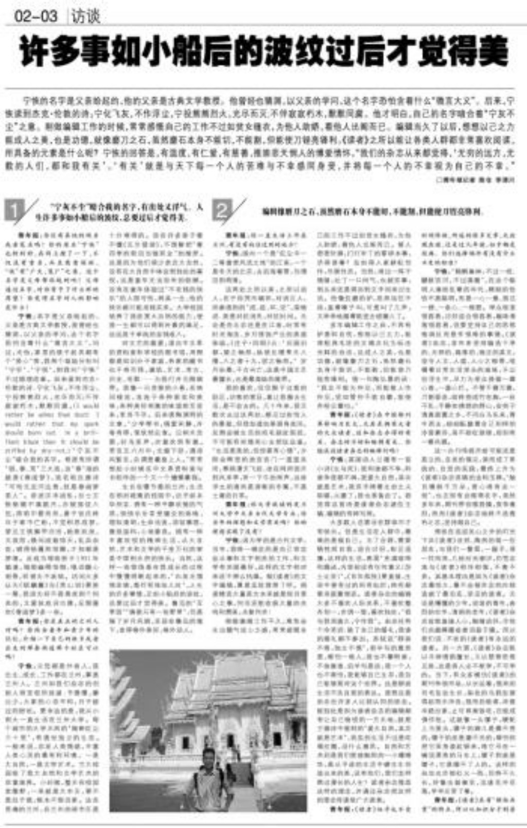 青年报:你还有其他的网名或者笔名吗?你的原名“宁恢”也特别好,在网上搜了一下,不仅没有重名,而且寓意深刻,“恢”有“广大,宽广”之意。这个名字是父母帮你起的吧?父母通过名字,对你寄予了什么样的厚望?你觉得名字对人的影响是什么?