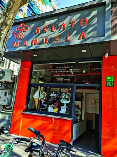 去Gelato Manuela采访,找到门店的时候多少有点吃惊:小小的门店在居民区一隅,虽然对面就是大宁国际商业广场,但宽阔的交通要道、马路中间的绿化隔离带,让对面的人过马路都颇为麻烦。这样的冰淇淋店,能开得下去吗?