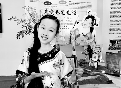 周岂加同学发明“真空免洗毛笔笔帽”。 本版摄影 青年报记者 郭颖