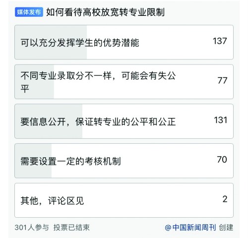 微博上,在《中国新闻周刊》创建的“如何看待高校放宽转专业限制”的一项投票中,“可以充分发挥学生优势潜能”“要信息公开,保证转专业的公平和公正”成为最高的两项关注。