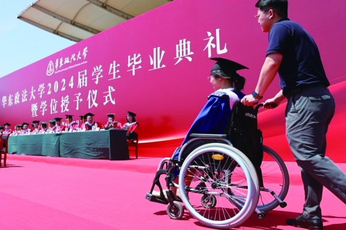 昨天上午,在华东政法大学2024届学生毕业典礼暨学位授予仪式上,一名坐在轮椅上的同学完成了她“迟到”的毕业典礼。她是程艳芳,华东政法大学马克思主义学院2019届毕业生,早在五年前毕业的她,在今年夏天才真正完成了属于她的毕业仪式。