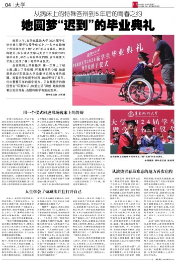 五年之后,各方面的情况变得稳定。今年3月,程艳芳在微信上向辅导员夏梦颖老师表达了想要返校参加毕业典礼的心愿。“这是我一直萦绕在脑海的一个强烈念头,我要克服困难来参加毕业典礼,回到这个我梦想最开始的地方。”程艳芳告诉记者,当初学校不管多远,也要赶来河南的医院,为她专门举办病床上的论文答辩,不曾放弃每一个学子的梦想,这也是为她上的一堂“人生之课”,如今,她想再次回到学校,用一个仪式回应那场病床上的答辩。