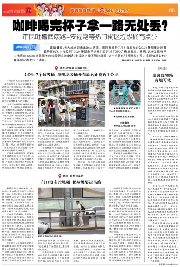 正值暑假,各大城市迎来出游大客流。据同程旅行7月8日发布的《2024暑期旅游消费趋势报告》,上海位列“2024暑期亲子游热门目的地TOP20”榜单前三。然而,记者发现有不少市民向12345市民服务热线投诉在武康路、安福路上找不到垃圾桶,这一问题也引得游客叫苦。实际情况如何?青年报记者进行了调查。