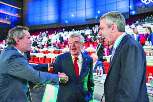 国际奥委会主席巴赫(中)在会议开始前和参会人员交谈。本版均为新华社图