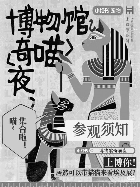 猫咪入馆之后也不是随意溜达的。“官方指南”还对猫咪活动范围进行了严格规定。这次夜场只开放上海博物馆人民广场馆舍一楼和二楼区域。二楼“消失的法老”区域猫不能进入,观众必须将猫寄存,博物馆有专业的工作人员在场全程监护。展厅内(除猫神庙区域)需将猫妥善安置在猫包/猫推车内,不得将猫放出。“萨卡拉的秘密”展厅内猫神庙区域可将猫放出合影,但必须使用牵引绳。展厅外区域可使用牵引绳约束猫适当活动(最长1米)。