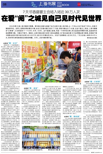 2024年第20届上海书展昨天落幕。青年报记者参与报道了迄今全部20届上海书展,从一个毛头小伙子变成了中年人,但是书展依然年轻。世界上老牌的那些著名书展,如法兰克福书展已经办了75届,伦敦书展也办了45届,从这个意义上来说,上海书展确实“正青春”,它还将迎来下一个20年、40年、100年。这不是痴心妄想,而是一个科学的论断,因为这座城市需要书展,这座城市的读者需要书展。书展无可取代。据统计,本届书展共吸引全国19家出版集团、357家出版社携16万余种精品图书参展,实现线下图书销售总码洋(图书标价总和)4814.83万元,较2023年增长约35%。文创产品销售收入近500万元。7天主会场入场约29.8万人次,周末两天参观券更是全部提前售罄。20年,上海书展热情不减。