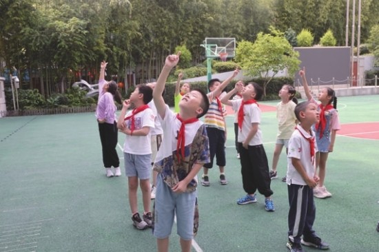 “抬起头,在保持双脚不动的情况下,迅速数一数‘追云板’上有多少白色的云朵。”一个班级在操场上活动时,陆倍倍带着孩子们做起了“追云操”。他介绍说,在教学楼高处挂着的“追云板”,有云朵、奖杯、纸飞机、三角形等各种不同的图案,学校体育教研组专门设计了一套“追云操”,每节体育课前都会让学生们做一做,通过“环视一周”“指认矮墙和教学楼外墙图案”“眼球转动”“眺望远方”等动作,缓解孩子们的眼部疲劳。