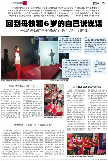 这场富有创意的对话,让陈芋汐情绪有些激动,在接下来给学弟学妹们寄语时,她眼含热泪一度哽咽。“她们演绎得非常好,走进了我内心,也问出了我当时的心理活动,所以我情绪比较激动。”陈芋汐说,这场“跨越时空的对话”让自己想起了记忆有些模糊的曾经,“感谢各位老师的用心策划。”