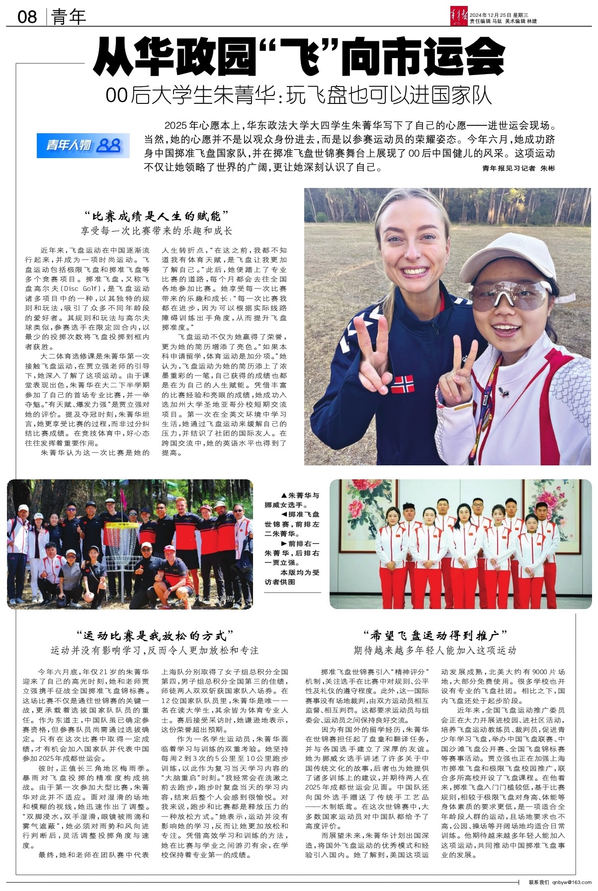 2025年心愿本上,华东政法大学大四学生朱菁华写下了自己的心愿——进世运会现场。当然,她的心愿并不是以观众身份进去,而是以参赛运动员的荣耀姿态。今年六月,她成功跻身中国掷准飞盘国家队,并在掷准飞盘世锦赛舞台上展现了00后中国健儿的风采。这项运动不仅让她领略了世界的广阔,更让她深刻认识了自己。