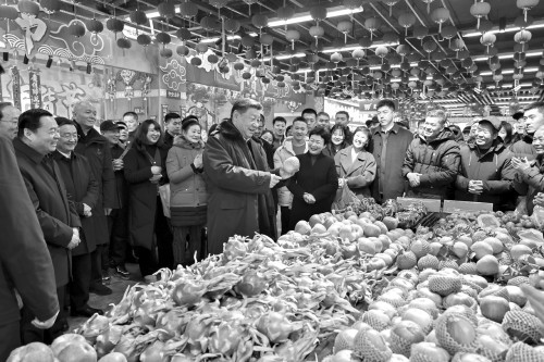 沈阳大东副食品商场历史悠久,富有特色的年节商品琳琅满目。23日上午,习近平来到这里,察看多家店铺,频频同店主和顾客交流,详细了解节日期间市场供应情况。大家见到总书记都十分激动,连声欢呼“总书记好”!习近平对大家说,“菜篮子”、“米袋子”、“果盘子”是民生大事,现在物质丰裕,过年团圆更要让大家吃得好、吃得健康。