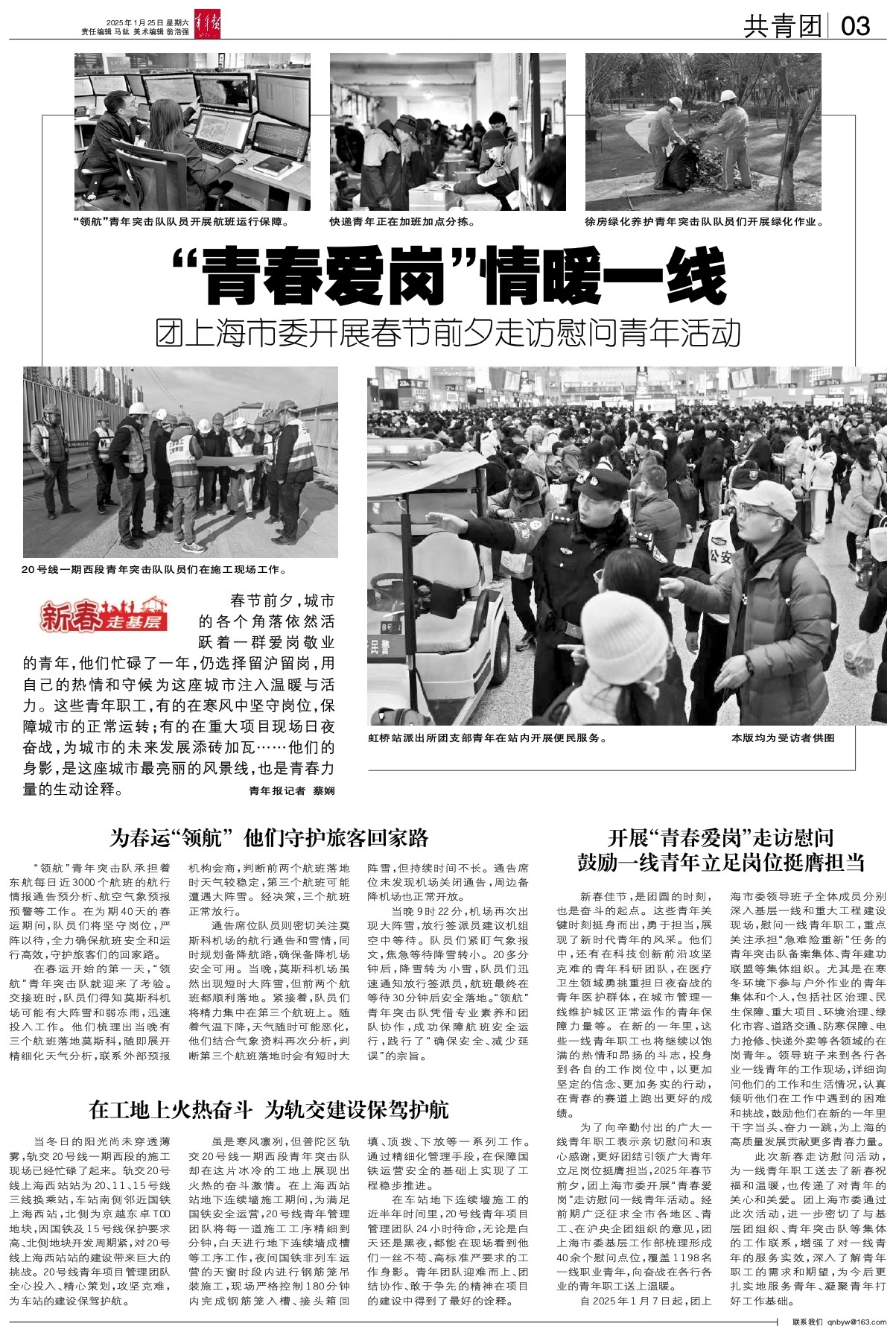 自2025年1月7日起,团上海市委领导班子全体成员分别深入基层一线和重大工程建设现场,慰问一线青年职工,重点关注承担“急难险重新”任务的青年突击队备案集体、青年建功联盟等集体组织。尤其是在寒冬环境下参与户外作业的青年集体和个人,包括社区治理、民生保障、重大项目、环境治理、绿化市容、道路交通、防寒保障、电力抢修、快递外卖等各领域的在岗青年。领导班子来到各行各业一线青年的工作现场,详细询问他们的工作和生活情况,认真倾听他们在工作中遇到的困难和挑战,鼓励他们在新的一年里干字当头、奋力一跳,为上海的高质量发展贡献更多青春力量。