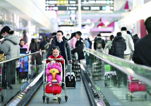 北京大兴国际机场航站楼内旅客熙熙攘攘。