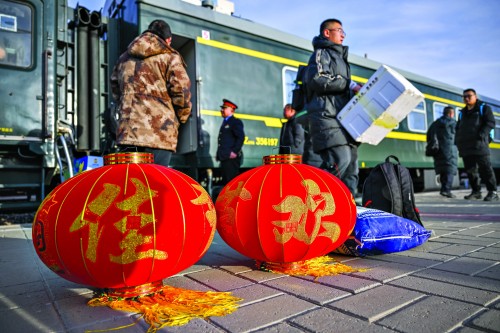 乘客带着春节用的红灯笼在赛汗塔拉站等车。