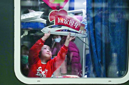 一名小乘客拿着“回家过年”的标牌在车厢内玩耍。本版均为新华社图