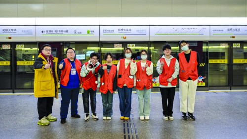 赵佳丽从2015年开始参与春运地铁志愿服务,今年正好是第十年。2020年以前,她主要在上海火车站站参与清晨的“双头班车”保障。“在上海火车站的时候差不多早上4点多到岗,工作到早上7点多早高峰开始之前,主要帮助车站疏导一晚上积攒的到达客流,协助他们买票进站。”赵佳丽说。而在今年,她除了在虹桥火车站外,还带领自己的团队首次前往新开通的市域机场线虹桥2号航站楼站、浦东1号2号航站楼站开展志愿服务。4日晚上9点,结束了在市域机场线虹桥2号航站楼站的志愿者工作后,她“转战”至600米外的虹桥火车站站,准备服务到次日凌晨加班车结束。