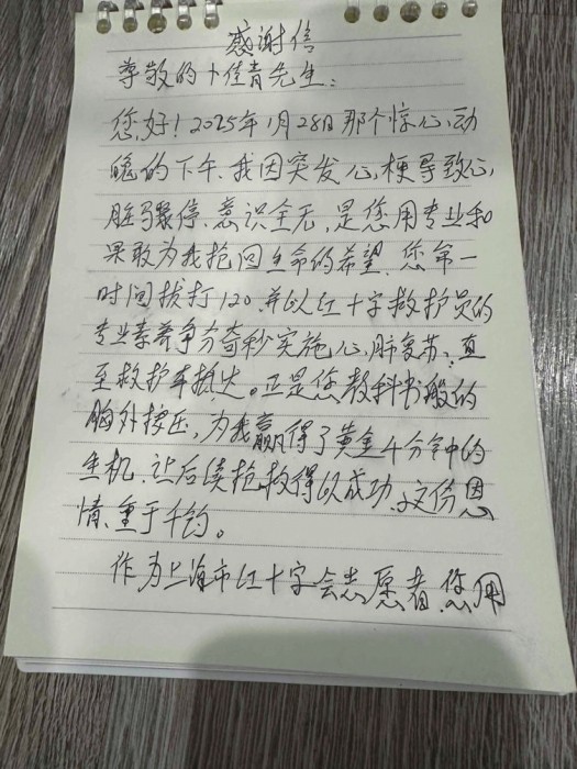 “您好!那个惊心动魄的下午,我因突发心梗导致心搏骤停、意识全无,是您用专业和果敢为我抢回生命的希望。您第一时间拨打120,并以红十字救护员的专业素养争分夺秒实施心肺复苏,直至救护车抵达。正是您教科书般的胸外按压,为我赢得了黄金4分钟的生机,让后续抢救得以成功。这份恩情,重于千钧。作为上海市红十字会志愿者,您用行动诠释了‘人道、博爱、奉献’的红十字精神。您不仅是社区里的急救先锋,更是用善举托起生命方舟的摆渡人。您的专业与担当,让我深刻感受到志愿服务的伟大力量,也让我对‘邻里守望’有了更崇高的理解。在此,感谢您!”
