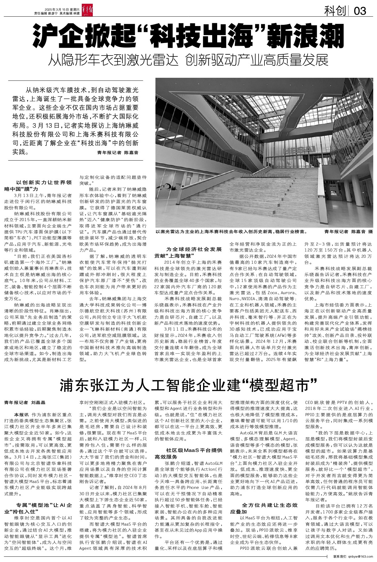 从纳米级汽车膜技术,到自动驾驶激光雷达,上海诞生了一批具备全球竞争力的领军企业。这些企业不仅在国内市场占据重要地位,还积极拓展海外市场,不断扩大国际化布局。3月13日,记者实地探访上海纳琳威科技股份有限公司和上海禾赛科技有限公司,近距离了解企业在“科技出海”中的创新实践。