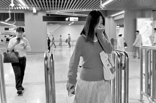 14号线静安寺站与2号线换乘通道处行人捂住口鼻。本版摄影 青年报记者 施培琦