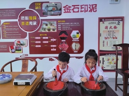 为了掌握这项非遗技艺,学校篆刻老师蒋姗姗利用节假日去传习所求教学艺。“学习初期,调配朱砂比例总出错,不是颜色暗沉,就是黏性不足,反复试验却屡屡失败。”但蒋姗姗从未放弃,她仔细记录操作细节,不停地调试、记录、比对,反复研究。经过无数次尝试,她终于调配出了色泽鲜艳、质地细腻的印泥,成功掌握了这门技艺,能在劳动课上将这份非遗瑰宝传递给孩子们。
