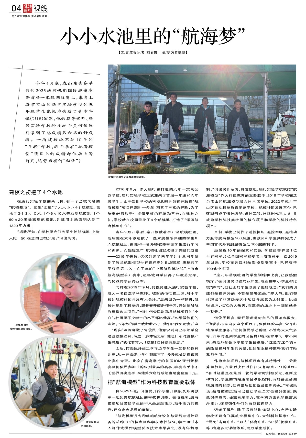 今年4月底,在山东青岛举行的2025遥控帆船国际邀请赛暨首届一米级洲际赛上,来自上海市宝山区庙行实验学校的五年级学生张振坤荣获了青少年组(U18)冠军,他的指导老师、庙行实验学校科技辅导员何俊民则拿到了总成绩第六名的好成绩。一所建校还不到10年的“年轻”学校,近年来在“航海模型”项目上的成绩却位居上海前列,这背后有何“秘诀”?