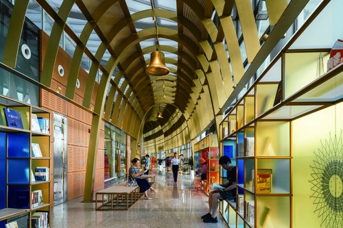步入书房,绿植与多边形座椅延续车站的生态人文氛围,50米长的金色钢铁拱廊分成三段层层递高,既承袭了中西融合的木质金字拱廊意象,又暗合从蒸汽时代到高铁时代的交通文明演进。“本来只是想找个地方歇脚,一进来就被书架上介绍浙江旅游景点的书吸引了。”旅客李女士说,“本来就打算带孩子去杭州玩,现在刚好可以改改旅游攻略。”