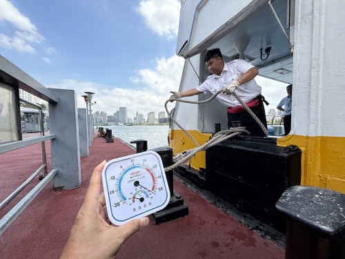 头班船早上4:40起航,上午10点,一直在甲板上忙碌的05后水手凌嘉琦身上的工作服已经反复湿了好几遍。此刻,记者带去的温度计在码头上测到的室外温度已经超过了50℃。