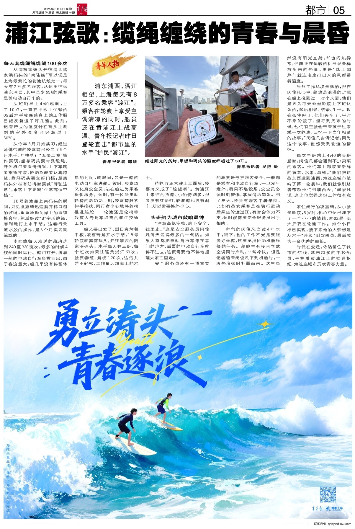 浦东浦西,隔江相望,上海每天有8万多名乘客“渡江”。乘客在轮渡上享受空调清凉的同时,船员还在黄浦江上战高温。青年报记者昨日登轮直击“都市里的水手”护民“渡江”。