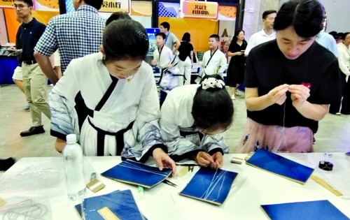在钟书阁“古书装订”体验活动区,学生正专注地穿针引线,体验复刻古书的装订过程。此刻,书籍不仅可供阅读,更能让人亲手触摸。小学四年级的黄同学说,“最有挑战的是穿线的时候,要捏紧线的后端,不然线头会从针孔处滑落。在体验装订的过程中,我感受到了书籍的珍贵和不易,也让我产生了要多多读书的想法”。此外,现场还有“家+书屋”非遗拓印书签、定制书包等手工体验活动,让青少年从多维度感受书籍的魅力。