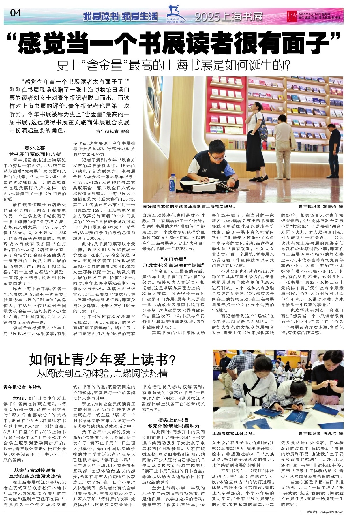 本报讯 如何让青少年爱上读书?答案也许藏在翻动书籍纸页的那一刻,藏在旧书交换时“原来你也喜欢它”的共鸣中,更藏在“今天,我是这家书店的小主理人”那一刻的自豪。8月13日至19日,2025上海书展暨“书香中国”上海周松江分会场主题系列活动同步开启。昨天,青年报记者走进松江分会场,探寻阅读不止于书、不止于展的答案。