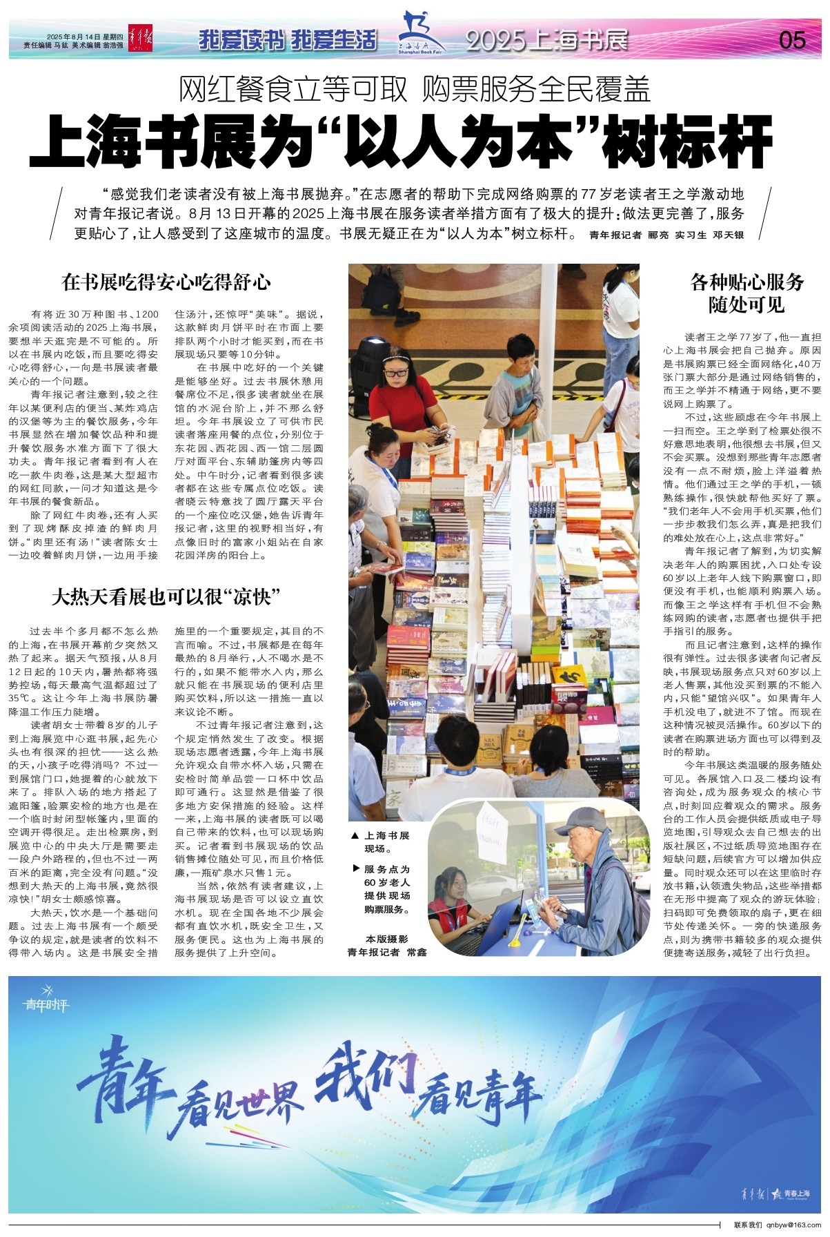 “感觉我们老读者没有被上海书展抛弃。”在志愿者的帮助下完成网络购票的77岁老读者王之学激动地对青年报记者说。8月13日开幕的2025上海书展在服务读者举措方面有了极大的提升:做法更完善了,服务更贴心了,让人感受到了这座城市的温度。书展无疑正在为“以人为本”树立标杆。