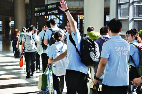志愿者在机场向亲友挥手告别。青年报记者 吴恺 摄