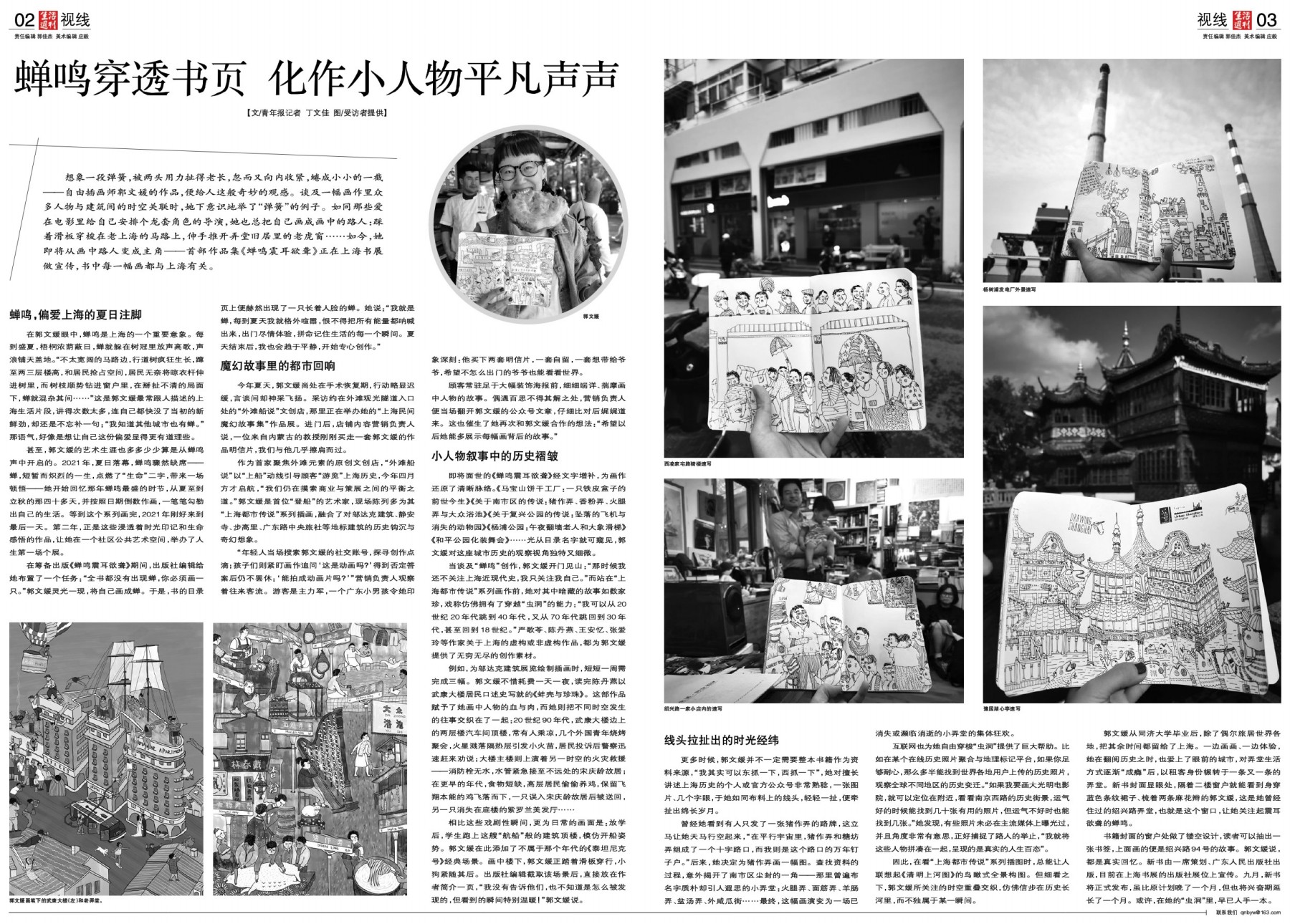 想象一段弹簧,被两头用力扯得老长,忽而又向内收紧,蜷成小小的一截——自由插画师郭文媛的作品,便给人这般奇妙的观感。谈及一幅画作里众多人物与建筑间的时空关联时,她下意识地举了“弹簧”的例子。如同那些爱在电影里给自己安排个龙套角色的导演,她也总把自己画成画中的路人:踩着滑板穿梭在老上海的马路上,伸手推开弄堂旧居里的老虎窗……如今,她即将从画中路人变成主角——首部作品集《蝉鸣震耳欲聋》正在上海书展做宣传,书中每一幅画都与上海有关。