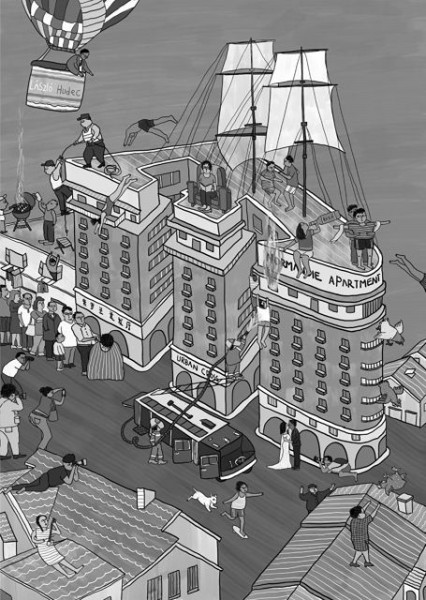 例如,为邬达克建筑展览绘制插画时,短短一周需完成三幅。郭文媛不惜耗费一天一夜,读完陈丹燕以武康大楼居民口述史写就的《蚌壳与珍珠》。这部作品赋予了她画中人物的血与肉,而她则把不同时空发生的往事交织在了一起:20世纪90年代,武康大楼边上的两层楼汽车间顶楼,常有人乘凉,几个外国青年烧烤聚会,火星溅落隔热层引发小火苗,居民投诉后警察迅速赶来劝说;大楼主楼则上演着另一时空的火灾救援——消防栓无水,水管紧急接至不远处的宋庆龄故居;在更早的年代,食物短缺,高层居民偷偷养鸡,保留飞翔本能的鸡飞落而下,一只误入宋庆龄故居后被送回,另一只消失在底楼的紫罗兰美发厅……