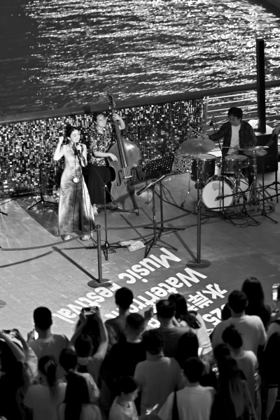 晚上八点半,黄浦江西岸梦中心船坞码头的驻唱演出准时开场。舞台设在临江的下沉式广场,柔和灯光洒向草坪与阶梯。市民三五成群聚集,将乐队围成半圆。从攀岩馆出来的小姚和朋友们也是常客,“刚好赶得上演出,常常还能碰到熟人”。