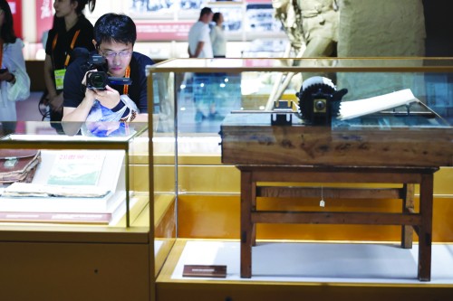 8月27日,一名记者在中国人民抗日战争纪念馆内采访。新华社 图