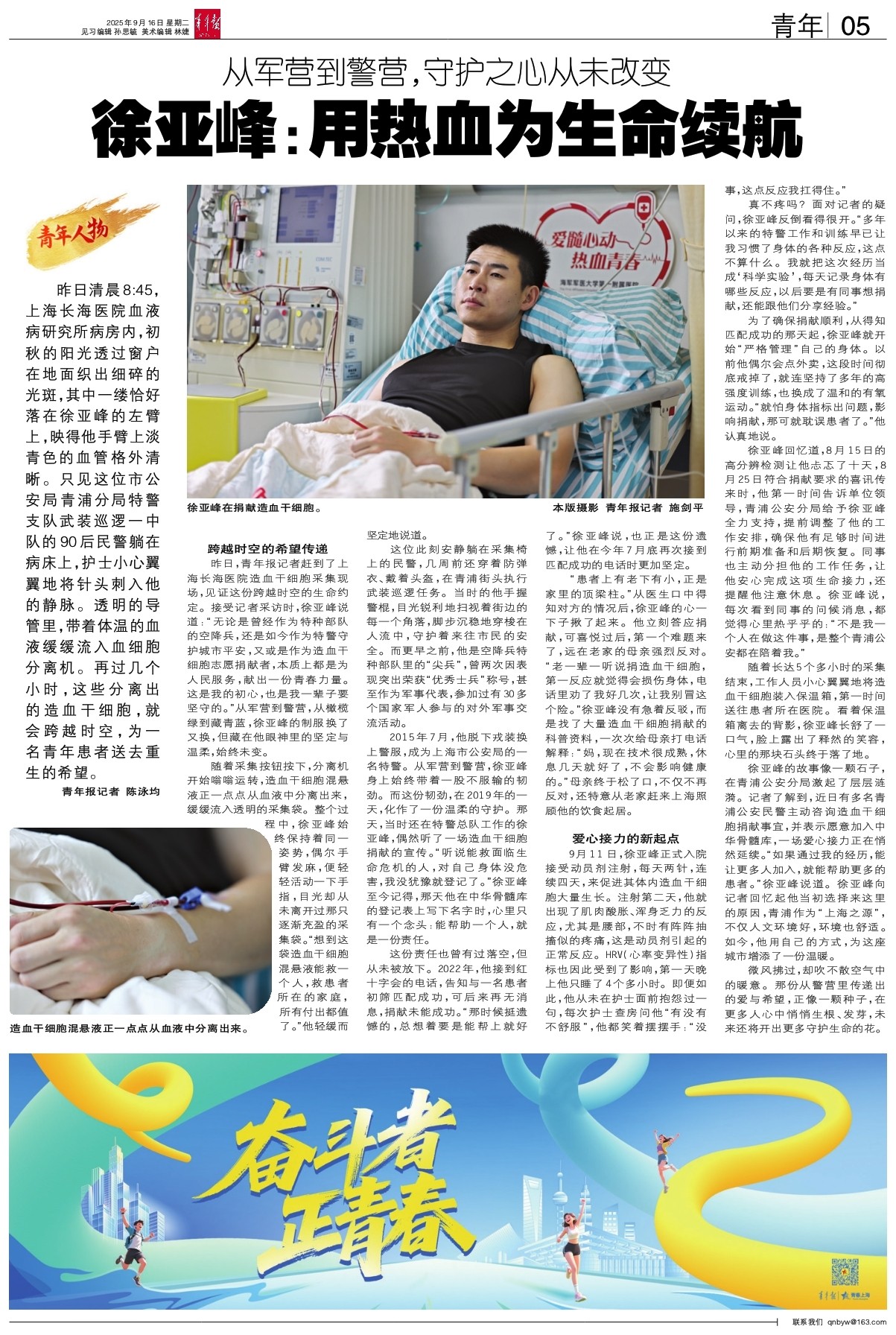 昨日清晨8:45,上海长海医院血液病研究所病房内,初秋的阳光透过窗户在地面织出细碎的光斑,其中一缕恰好落在徐亚峰的左臂上,映得他手臂上淡青色的血管格外清晰。只见这位市公安局青浦分局特警支队武装巡逻一中队的90后民警躺在病床上,护士小心翼翼地将针头刺入他的静脉。透明的导管里,带着体温的血液缓缓流入血细胞分离机。再过几个小时,这些分离出的造血干细胞,就会跨越时空,为一名青年患者送去重生的希望。