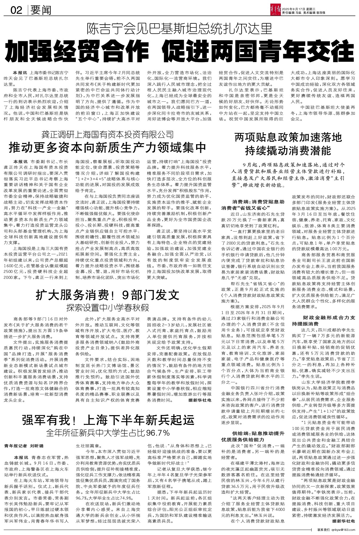 在上海火车站,军地领导与新兵握手话别。仪式上,新兵代表、新兵家长代表、接兵干部代表分别发言。市委常委、常务副市长吴伟勉励新兵,要牢记从军报国的初心,早日练就过硬本领和优良作风,以满腔热血献身强军兴军伟业,用青春年华书写人生壮丽篇章。