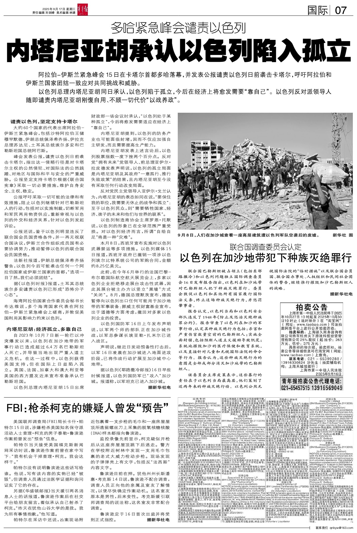 峰会发表公报,谴责以色列日前袭击卡塔尔,指出这一侵略行径是对卡塔尔主权的公然侵犯、对国际法的公然践踏、对地区与国际和平与安全的严重威胁。公报坚定支持卡塔尔根据《联合国宪章》采取一切必要措施,维护自身安全、主权、稳定。